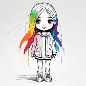 一个充满活力的Q版女孩,全身像,处于奔跑姿态。强烈的动态运动感。完全通过极简线条艺术和粗黑墨水轮廓描绘。充满活力的彩虹水彩从女孩的位置向外爆发,水彩滴落四溅。抽象几何形式破碎并散落在周围。坚实的纯白色背景,极简线条艺术。