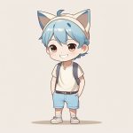 一个极简动漫Q版猫耳少女,全身站姿,干净的浅绿色纯色背景,柔和圆形轮廓,水灵大眼睛,小嘴巴,线条粗且干净,细节有限,明亮色彩,充满可爱魅力。