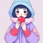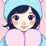 A lighthearted simple doodle illustration of a cute Japanese girl dressed in caramel-toned winter fashion. The style features soft rounded lines and minimal details. It uses a warmer variation of the pastel color palette, incorporating gentle shades of pink lavender and baby blue. She has an innocent playful expression, achieving a charming aesthetic.