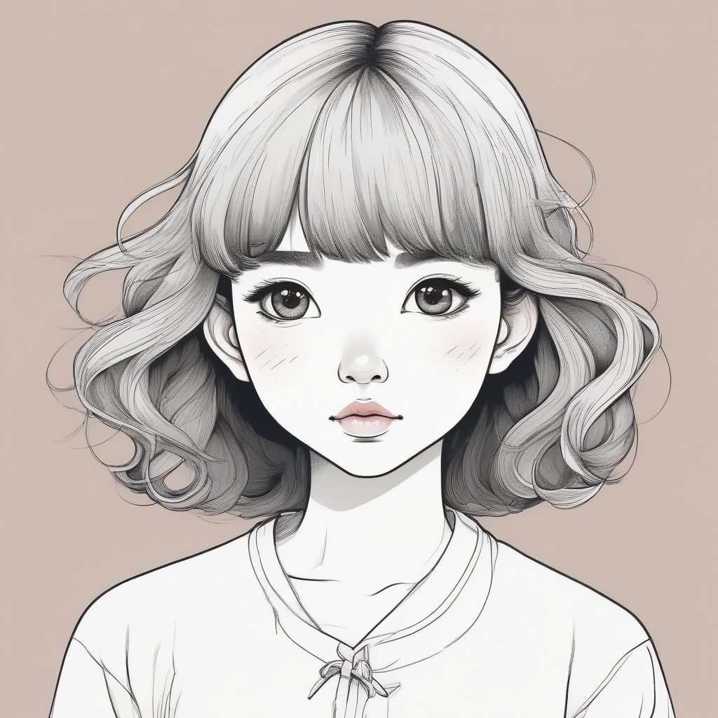 一个极简手绘线稿插画的日系少女动漫肖像。特征是美丽的细节眼睛,红润的脸颊(rosy cheeks)和超光泽的嘴唇。插画风格,采用彩色铅笔和蜡笔混合技法,温暖色彩。整体异想天开(whimsical),具有故事书的氛围,柔和边缘,纸张肌理明显,纯色背景。