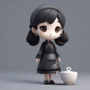 AI art prompt English – Gold Embroidered Black Cheongsam Chibi: Shy Fan Hiding Action