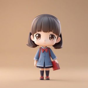 一个简单的主体, 一个极简动漫角色卡哇伊Q版人物, 可爱, 粘土材质, 3D渲染, C4D, Octane渲染, 盲盒风格。一个Q版少女, 全身站立照, 穿着黑色丝绒金色刺绣旗袍, 扎着双髻。她羞涩地用一把折扇遮住了半张脸, 露出眼睛。高度抛光的3D渲染, 呈现出奢华的布料质感。干净、简单、纯尘紫色背景, 单人。