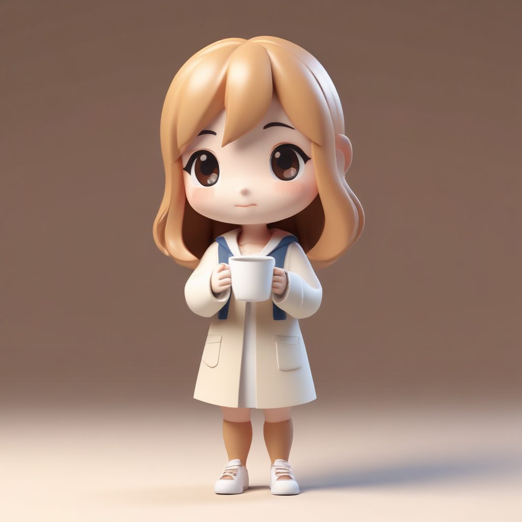 一个极简可爱的Q版女孩,全身站立姿势,拥有夸张的大头和娇小的身体。她穿着休闲服装,动作是优雅地品尝着一杯热咖啡,表情满足而放松。风格为盲盒手办美学,材质为光滑的粘土。这是一个高保真的3D渲染,使用C4D和Octane渲染器。场景使用了精确的光线追踪和柔和的工作室照明,突出了柔和的焦糖棕色调。背景是干净、简单、纯米白色的,完全空白。以高细节的8K分辨率渲染。