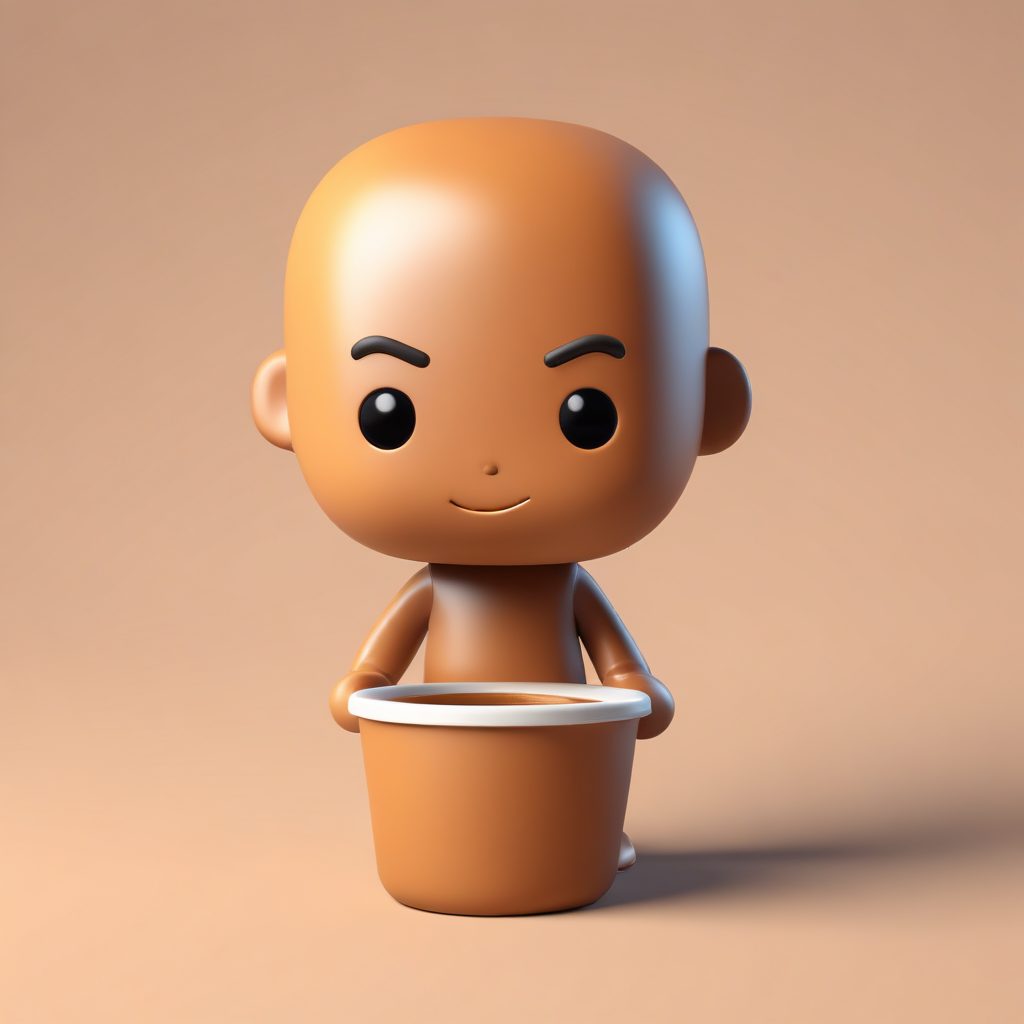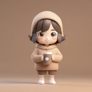 A minimalist cute chibi caffeine warrior, full body standing pose, big head small body proportion, styled as a workplace worker-themed trendy blind box figure. The character uses smooth clay material, showing an exaggerated tired expression while hugging a massive coffee cup. High-fidelity 3D render achieved using C4D and Octane render engines. Utilizes ray tracing and soft studio lighting, highlighting soft pastel coffee-brown colors. 8K high detail. Background is a clean, simple, solid coffee-brown color, completely empty, with no textures.