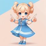 A full body illustration of a kawaii chibi girl in cute style, with a big head and small body, standing and smiling playfully, wearing a pastel pink dress, on a clean solid baby blue background, minimalist and flat design, bold outlines, no shading, large sparkling eyes, expressive hands, simple shapes, cheerful expression.