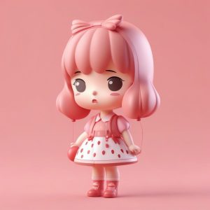 一个极简动漫卡哇伊Q版女孩,全身照,单人,穿着鲜亮的条纹泳装和太阳帽,快乐的闭眼微笑,拿着一个冰淇淋甜筒,泡泡玛特风格,盲盒美学,光滑的粘土纹理,明亮的热带色彩,3D渲染,C4D光照,纯色海洋蓝色背景,高质量,8k。