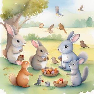 AI art prompt English:cute watercolor storybook animals, playful rabbits, foxes and bears, soft pastel color palette, lush forest background, children’s illustration, whimsical style