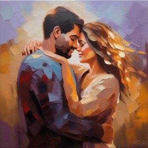浪漫油画厚涂情侣肖像,湖畔情侣相依,动力感厚重笔触,夕阳倒影发光,柔和橙粉调,浪漫经典光感,油画厚涂浪漫辉光艺术。