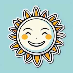 一个可爱的扁平化黄色太阳,带微笑表情,采用卡哇伊风格,放置于纯净的天蓝色背景。细节极其简单,色彩对比鲜明,采用圆形展示,氛围愉快,无任何阴影。