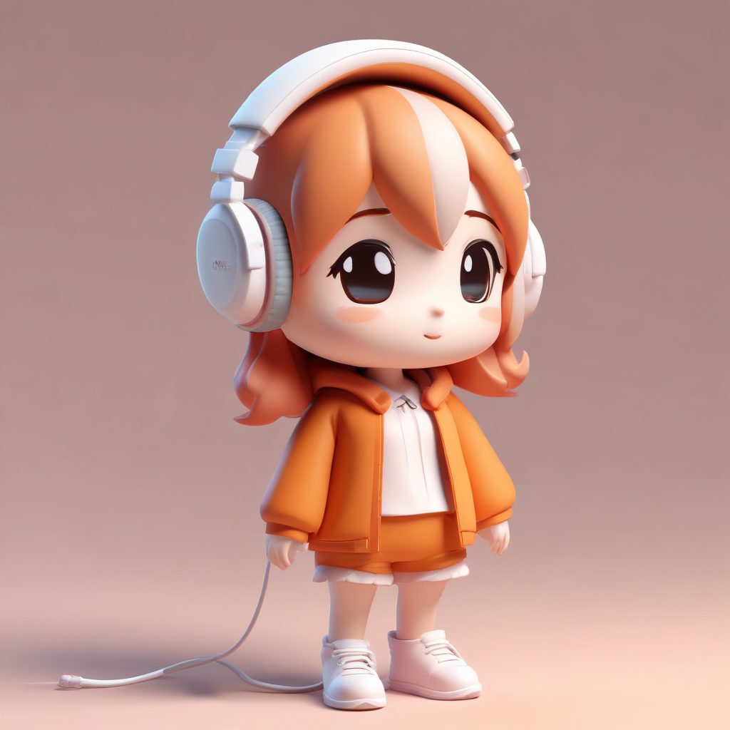 一个极简可爱的Q版女孩,全身站立姿势,拥有夸张的大头和娇小的身体。她戴着巨大的耳机,动作是放松地站着享受音乐,表情平静而愉悦。风格为盲盒手办美学,材质为柔软的粘土。这是一个高保真的3D渲染,使用Octane渲染器和C4D技术。场景使用了精确的光线追踪和柔和的工作室照明,突出了柔和的温暖橙色调。背景是干净、简单、纯橙色的,完全空白。以高细节的8K分辨率渲染。
