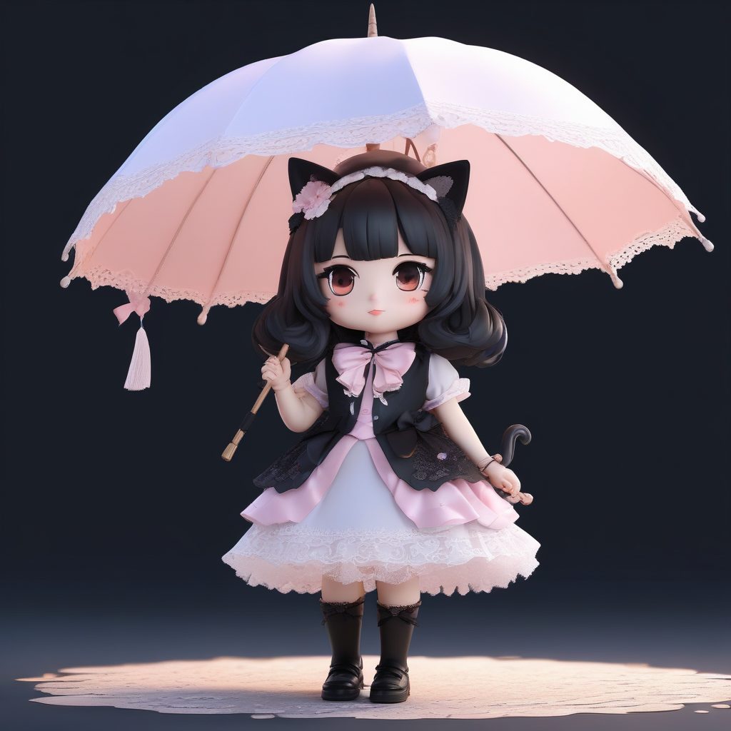 一个极简动漫角色,卡哇伊Q版风格的猫耳娘,穿着精致的甜美哥特洛丽塔洋装,配有复杂的蕾丝、缎带,并拿着一把精巧的装饰伞。可爱且丰富的表情,全身站立照,动态姿势。使用C4D和Octane渲染引擎进行照片级8K细节渲染。利用光线追踪(Ray tracing)和柔和的工作室灯光提供全局照明。使用柔和、充满活力的马卡龙色调。背景:纯净、简单的纯黑色,干净、空旷。单人。