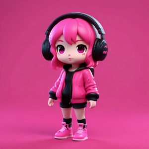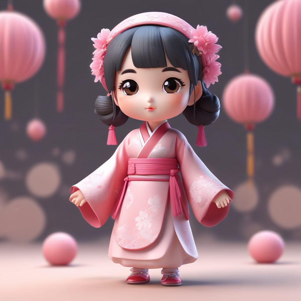 一个全身站立的可爱Q版汉服小女孩,穿着时尚的粉色系汉服,采用甜美的盲盒手办美学。拥有巨大的头部和娇小的身体,表情是夸张的、愉快的跳跃动作。材质是光滑精致的黏土质感,通过C4D和Octane渲染器实现。柔和的工作室照明配合光线追踪技术,突显柔和的马卡龙色调。8K高细节渲染,背景是纯白色,干净简洁,完全没有图案或纹理。