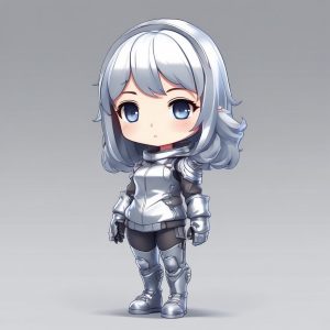 一个可爱的Q版人物,全身站立,穿着黑色的未来主义机能风冬装,配有复杂的搭扣和金属配件。人物表情酷炫且坚定,动作丰富。盲盒美学,大头小身体。高保真3D渲染,使用Octane渲染和C4D,呈现具有光泽感的黏土材质。光线追踪和柔和工作室照明。虽然是黑色系,但使用柔和色彩作为点缀。8K高细节。背景:纯黑色,干净,完全空白,无纹理。