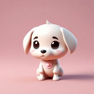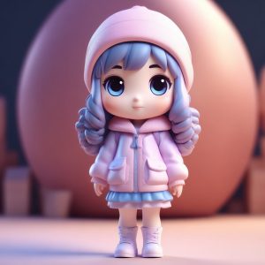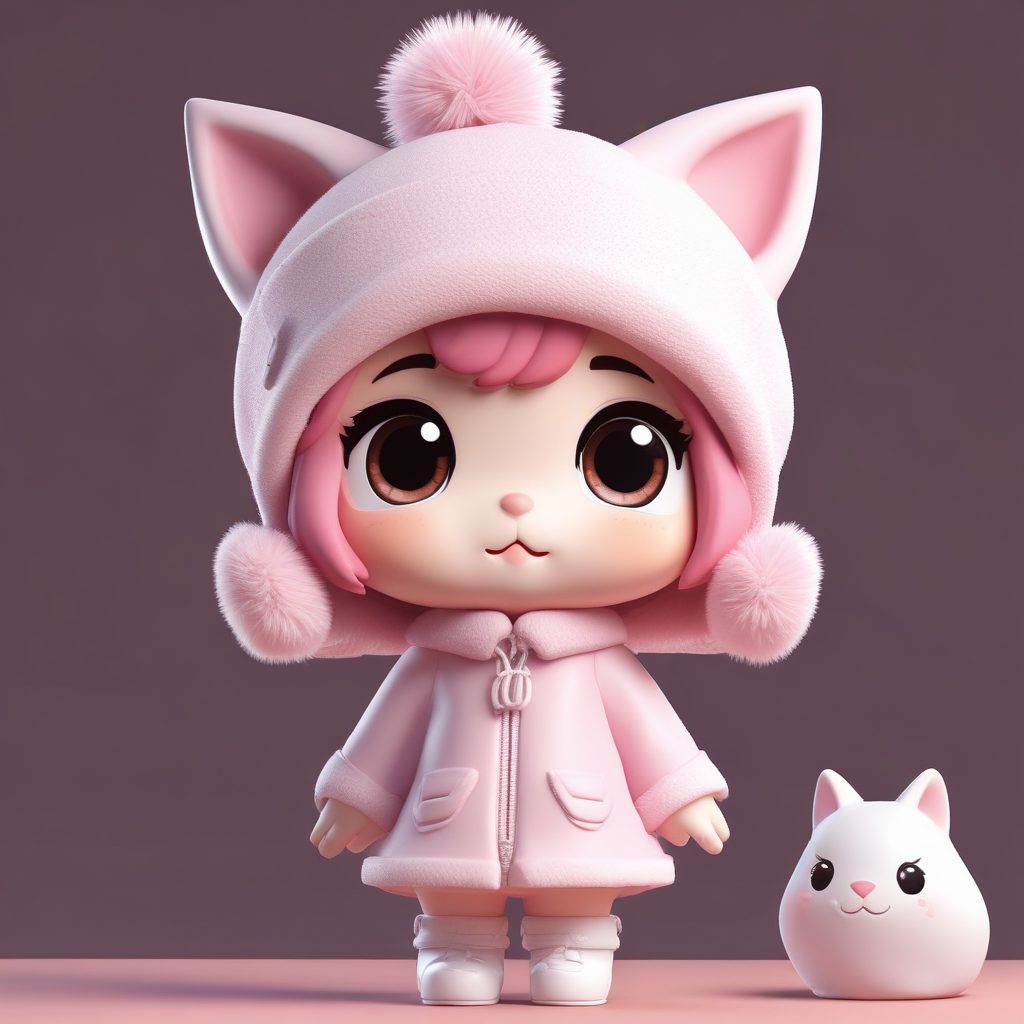 A full body standing photo of a cute, kawaii chibi girl character with a big head and small body, wearing a fluffy cat ear winter hat, with a rich, innocent expression, captured in a tilted head pose. Designed in the blind box figure aesthetic. Features a mixed clay material with soft furry texture. High-fidelity 3D render achieved using Octane render engines. Ray tracing and soft studio lighting emphasize sweet pink and white pastel colors. Rendered in 8k high detail. Background: solid color, clean, simple light pink, completely empty, no textures.