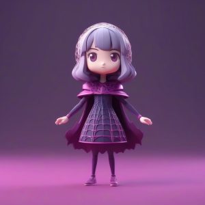 一个简单的主体,一个极简动漫角色卡哇伊Q版公主,可爱,粘土材质,3D渲染,C4D,Octane渲染,盲盒风格。全身站立照,单人。美食逃亡者公主,偷偷拿着一块偷来的皇家蛋糕,脸上带着快乐而又有一点点心虚的表情。姿态圆润可爱。背景:纯色、干净、简单的薰衣草灰色背景,没有图案或细节。