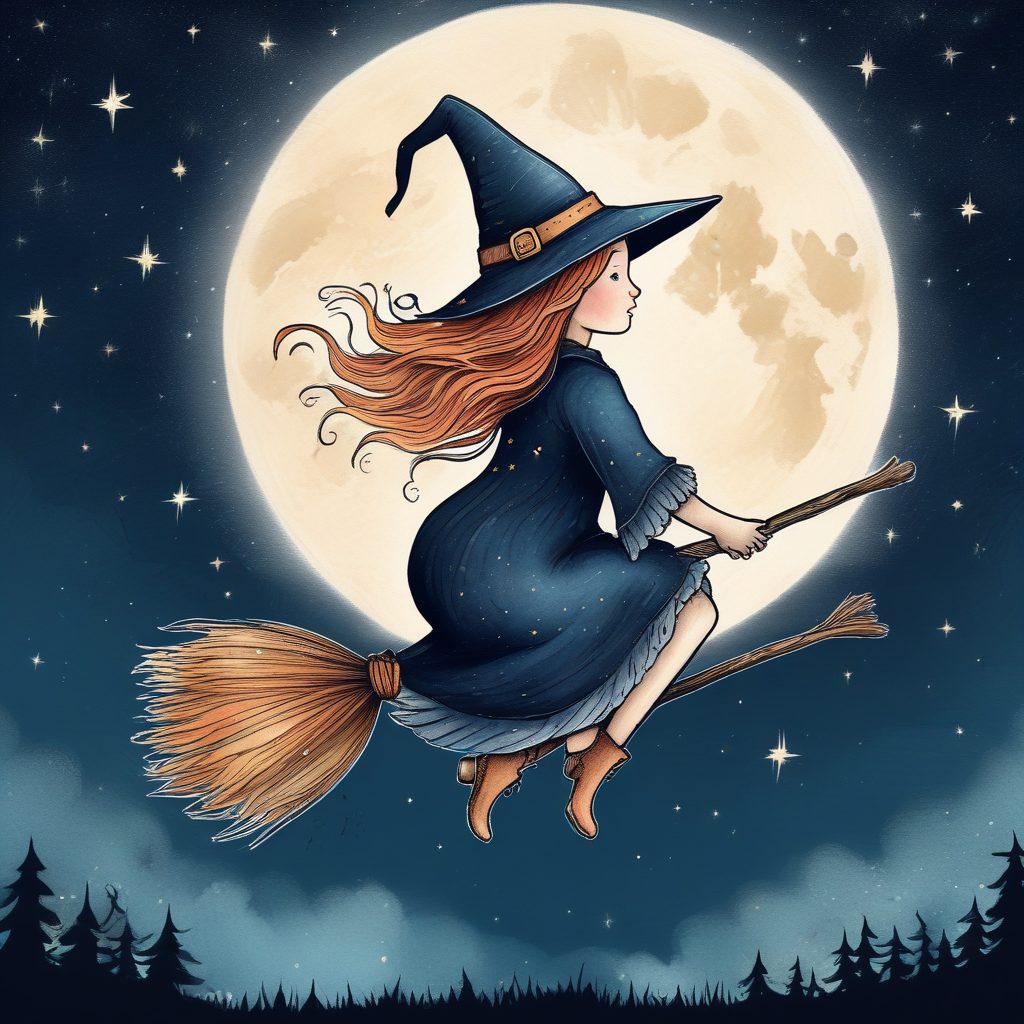 一张迷人的手绘插画,描绘一个穿着朴素服饰的小女巫,乘坐扫帚在星空下飞翔。风格是柔和边缘的童趣绘本风格,使用蜡笔和彩色铅笔混合媒介。色彩采用奶油色和柔和色彩,散发着温暖的光芒。强调粗糙的纸张纹理和精细的笔触,营造出异想天开的、富有故事感的画面。