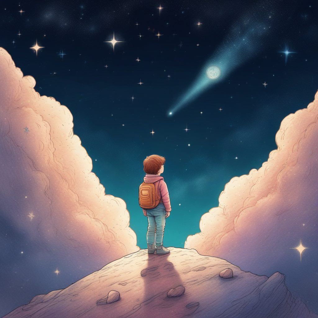 A whimsical, healing hand drawn illustration depicting a small person standing alone on a tiny asteroid floating in space, gazing at the stars. Utilizes colored pencil and crayon style, the colors are deep pastel colors with soft warm color highlights. Emphasizing soft edges and paper texture, the overall composition has a strong storybook style.