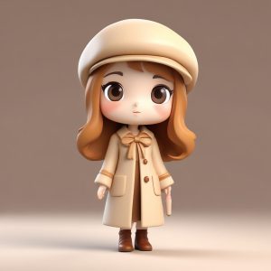 A cute chibi bunny girl, full body, standing, wearing a caramel winter coat and beret, wide-eyed, full of energetic expression. Blind box style, clay material texture, 3D render, C4D. Soft studio lighting, pastel colors, Octane render. High detail, 8k, Ray tracing. Background: solid color, clean, simple, completely empty, no patterns, No textures.