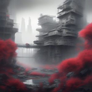 A futuristic sky-high transportation hub, colossal architecture floating in thick **mist**. **Surreal**, **intense portrait** perspective. Structures defined by **elegant inking** and **fine expressive lines**. Color palette: **light gray and light crimson**. The scene features **datamosh** artifacts and **glitchy** holographic advertisements displaying **furry art aesthetics**. Subtle **algeapunk** growths and **organic marine textures** on docking platforms. **Futuristic elements**, **dreamlike** quality.