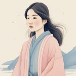 A cozy style illustration of a Japanese girl wearing a loose knitted cardigan. The image is minimalist line art, with pastel colors of pink and blue. The style is Hand drawn, featuring warm colors and soft edges. The image utilizes a colored pencil and crayon style, set on textured paper, exhibiting a whimsical storybook style.