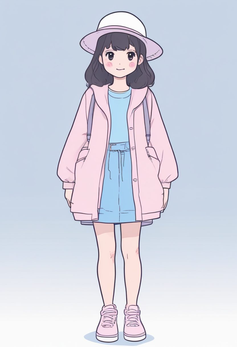 一位面带微笑的日系时尚女孩的全身像,采用可爱的涂鸦(cute doodle)风格。她穿着以温柔的粉薰衣草色和婴儿蓝为主的柔和调色板的服装。画面强调柔和圆润的线条和极少的细节,体现出轻松愉快的魅力美学。女孩的表情是天真俏皮的,全身站立姿势,极简背景。