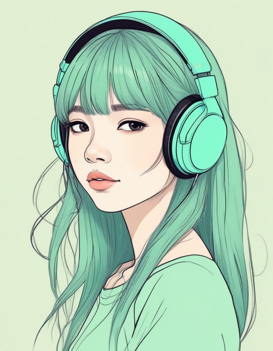 A cute Japanese girl avatar in minimalist line art illustration, featuring fringe bangs and shoulder-length hair, wearing headphones. The style is Hand drawn illustration, utilizing mint green and light yellow as primary pastel colors, mixing colored pencil and crayon style strokes. The image has strong paper texture and soft edges, creating a whimsical atmosphere. Solid mint green background.