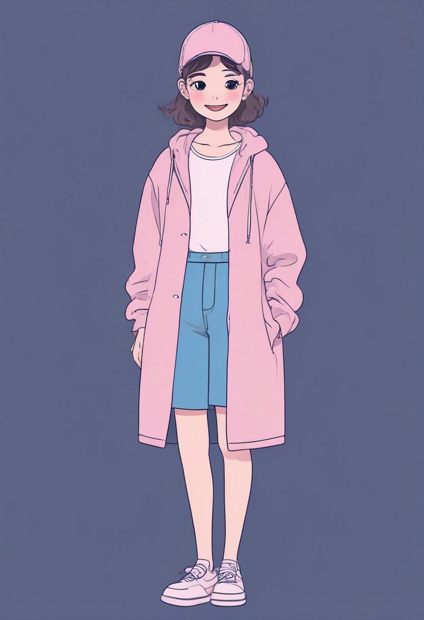 一位面带微笑的时尚女孩,全身站立姿势,采用可爱的涂鸦风格(cute doodle)。画面使用柔和圆润的线条和极少的细节,营造出一种轻松愉快的魅力美学。色彩为温柔的粉薰衣草和婴儿蓝的柔和调色板。她的表情天真俏皮,穿着极简软萌风的装扮。背景是柔和的渐变色,极简主义构图。