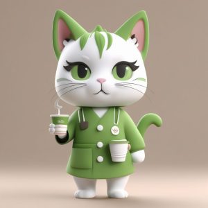 专业的AI提示词,用于生成一只正在享受抹茶拿铁的Q版女孩3D模型。强调其圆润和开朗的姿态,背景为清新的薄荷绿纯色。