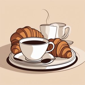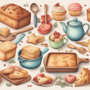 一个可爱的年轻女孩在厨房里分享甜点,半身插画。采用小清新故事书风格插画,手绘。使用奶油系的粉彩色调,细节采用细腻的彩铅和蜡笔风格笔触。柔和的边缘和明显的纸张纹理。