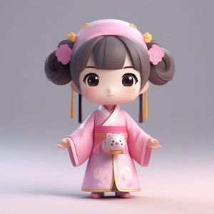 Octane渲染:红色系Q版汉服女孩持圆扇与白兔的全身照
