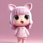 一张全景全身照片,捕捉了一个极简风格的卡哇伊q版动漫人物。她正处于一个动态的欢呼姿势中,脸上是极其丰富且可爱的兴奋表情。这件艺术品采用3D渲染和C4D建模,带有逼真的粘土纹理和盲盒美学。场景使用柔和的摄影棚灯光,背景是干净的纯紫红色,无任何纹理或图案。色彩是清新的粉彩,通过光线追踪实现,呈现出极致的8K高细节。