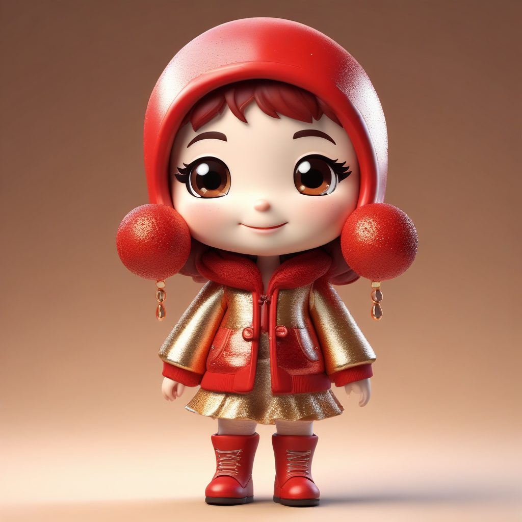 一个全身站立的可爱时尚Q版女孩角色,拥有大头小身,她穿着带有亮片元素的闪耀冬装,表情极其丰富,带着开心的露齿大笑。设计遵循盲盒手办美学。材质为光滑、带有亮光颗粒的粘土。这是一个高保真3D渲染,通过Octane渲染引擎实现。精确的光线追踪和柔和的工作室照明,突出了充满活力的红金柔和色彩。8K高细节。背景是干净、简单的纯红色纯色,完全空白。