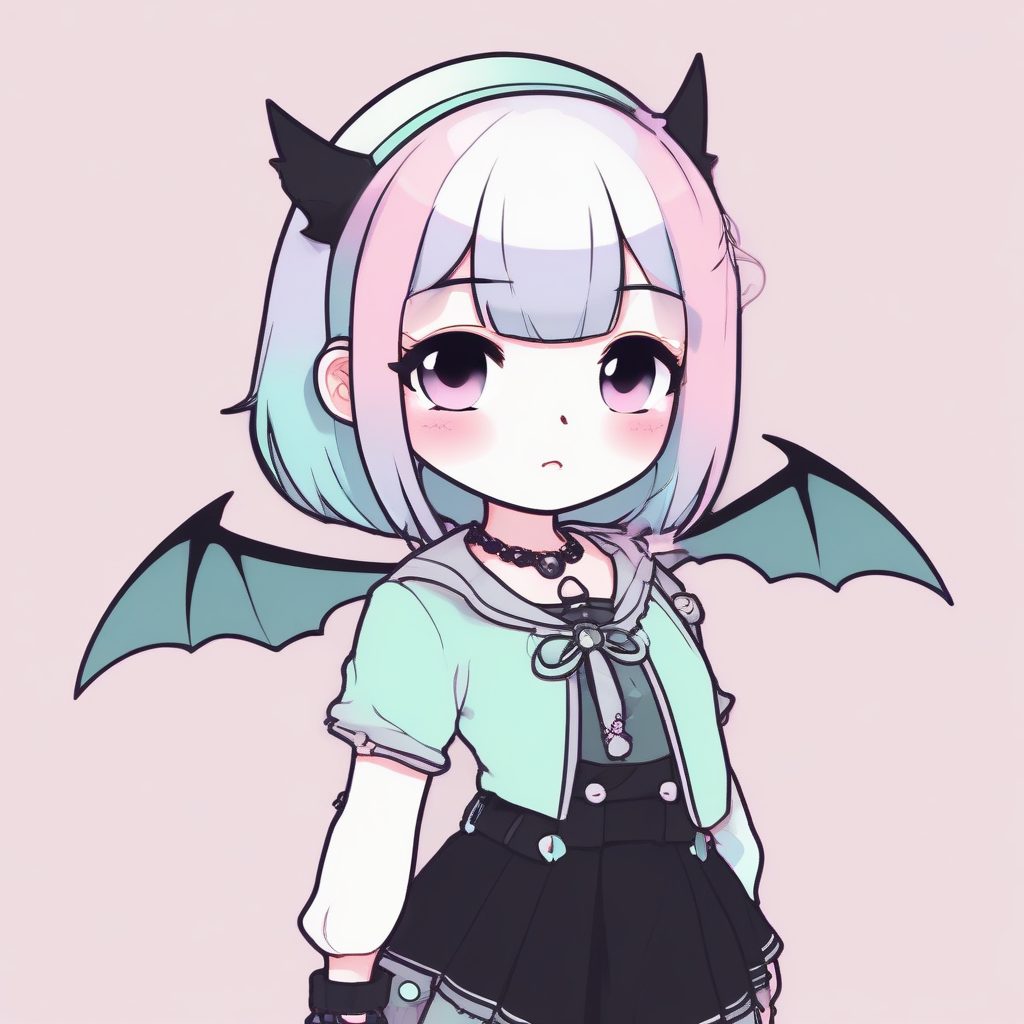 一个可爱的卡哇伊Q版柔和哥特女孩,全身站立照,拥有大头小身体比例。她以Pastel Goth风格装扮,柔和色彩搭配骷髅或蝙蝠印花。这个独行极简动漫角色被捕捉在一个动态的双手合十姿势中,展示着甜美且神秘的表情。柔和的粉色和薄荷绿色彩,利用光线追踪和柔和工作室照明进行8K高细节渲染。背景是干净、简单、纯黑色的平面颜色,完全空白。