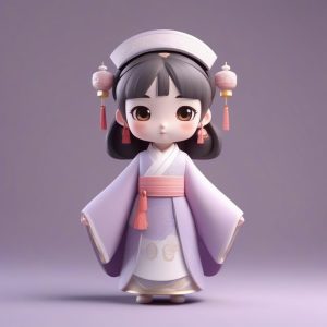 A single minimalist anime character kawaii chibi Characters, full body Standing Photo, ancient Chinese fairy with pink flowing robes and ornate hair accessories, standing on a tiny cloud. Octane render, 3D render, Cute, Pop Mart style, blind box collectible. Soft studio lighting, high detail, C4D, 8k, ray tracing. Pastel colors, Clay texture. Solo, expression is ethereal and cute. Clean, simple, solid lavender background.