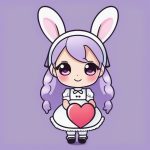 A minimalist chibi girl stylized as a retro pop art anime character, depicted as a rabbit-girl hybrid holding an acoustic guitar, set against a solid pastel background. The character features soft rounded lines, oversized expressive eyes, and simplified cute proportions typical of chibi style. No background elements or patterns, clean flat shading. The scene radiates playful positivity and modern pop culture vibes.