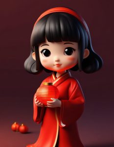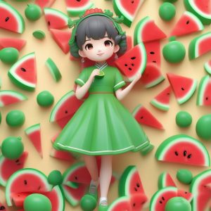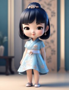 一个穿着轻盈夏季旗袍的Q版女孩,手持一把精致的小折扇,处于一个优雅的姿势。角色设计是大头、圆脸,带有一个自信且可爱的面部表情。这是一个高质量的3D渲染,拥有可爱的黏土人偶风格和盲盒纹理。由C4D和Octane渲染,光线追踪突显旗袍丝绸上的微妙褶皱。背景是简单的纯色薄荷绿工作室背景。
