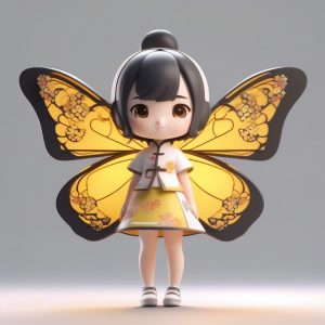 专注于青花瓷图案旗袍的Q版人物。全身站立,手捧小花瓶,展现娴静优雅的气质。采用Octane渲染,背景为纯净白色。