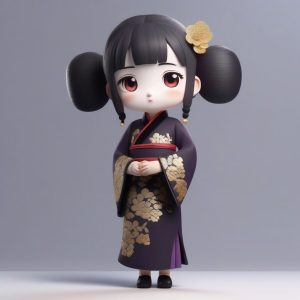 AI绘画提示词中文 – 青花瓷旗袍Q版:手捧花瓶的娴静少女3D图