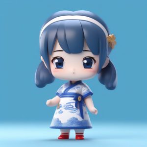 A single minimalist anime character kawaii chibi girl, Cute, Clay, 3D render, C4D, Octane render, blind box, full body standing photo, solo. Wearing a classic porcelain blue patterned Qipao, holding a small porcelain vase, serene and elegant expression. Highly polished 3D rendering, clear rounded porcelain pattern details. Clean, simple, solid white background.
