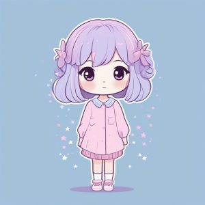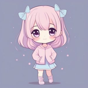 A cute anime chibi girl, full body, standing pose, captured in a light skipping or trotting moment, one foot off the ground. Simple doodle, cute doodle, pastel color palette, soft rounded lines, minimal details, gentle shades of pink lavender and baby blue, innocent playful expression, lighthearted, charming aesthetic. Solid color background.