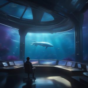 探索深海科幻唯美构图。生成被生物荧光照亮的潜水员。强调强烈的色彩对比和电影光照,打造令人惊叹的AI绘画。