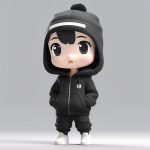 A dynamically standing, full body chibi girl illustration. She is performing a signature move from a viral dance trend, displaying a confident and cute expression. This figure is realized as a blind box collectible using clay material. Rendered as a 3D render using C4D and Octane render, ray tracing captures the high detail of the outfit. Soft studio lighting highlights the bright pastel colors. The Background is a clean, simple solid color, completely empty, with No patterns, No textures, outputted in 8k resolution.