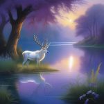 A stunning woodblock Japanese vintage prints art depiction of a majestic stag standing amidst a misty pine forest. Deep emerald greens and subtle smoky grays blend with warm earth tones, creating serene atmosphere. The stag’s antlers curve elegantly, detailed with gold highlight brushstrokes. Softly textured background emphasizes rolling hills and layers of mist, with stylized clouds floating overhead. The art reflects a harmonious balance between nature and wildlife.