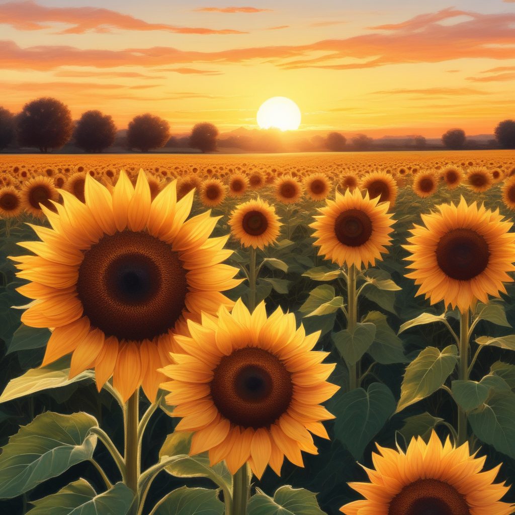A high-detail landscape illustration of a sunflower field at sunset. Rendered in an intricate hand drawn illustration style, emphasizing colored pencil and delicate strokes. The colors are warm orange and yellow pastel colors, with slightly soft edges, displaying subtle paper texture. The scene is filled with a healing and summer storybook mood.