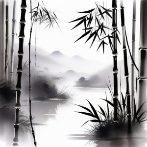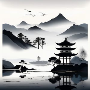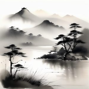 AI art prompt English:Whispers Of Tranquility, Japanese sumi-e ink wash landscape, misty mountains, serene nature, delicate brush strokes