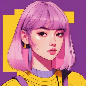 二次元极简风格女孩肖像,Q版,原宿Decora潮流风格(极简简化版),头发上点缀着简化的几何发夹和蝴蝶结。粗线条勾边,纯色块填充,赛璐珞风格,糖果马卡龙色系(粉红、黄、薄荷绿),低饱和度。扁平设计,干净利落。纯色淡紫色背景,简单、干净,突出主体配饰。单人。