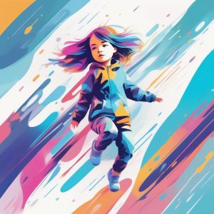 一个可爱的Q版女孩的现代插画,姿势简洁。矢量艺术插画风格,柔和的马卡龙色调占主导地位,呈现在干净的白色背景上。流畅的线条创造出几何轮廓。抽象的流体形状巧妙地融入到角色设计中。梦幻柔焦,极少的故障效果。色彩负片色调应用于阴影区域。液化扭曲用于艺术效果。