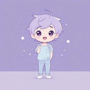 极简主义可爱Q版动漫男孩,全身像,夸张的旋转扭动姿势,柔软的衣服略微飘动,大而富有表现力的眼睛,大头小身。简单涂鸦,可爱涂鸦,柔和的色彩调色板,柔和圆润的线条,极少的细节,以柔和的粉色、薰衣草色和浅蓝色调绘制。天真俏皮的表情,轻松愉悦,迷人的美感。干净、纯白色背景。