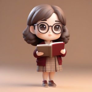 A soft academia princess, chibi, cute, full body, standing. Wearing a pastel plaid blazer, pleated skirt, and small wire-rimmed glasses, holding an old leather-bound book. Pop Mart style, blind box aesthetic. 3D render, C4D, Octane render, ray tracing. High detail 8k, featuring a delicate clay material texture. Soft studio lighting, natural pastel colors palette. Clean gradient background, No textures.