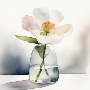 Soft and tiny Japanese style watercolor illustration of a small flower vase with delicate wildflowers. The colors are pale, the textures are light and airy, and the background is mostly blank, with gentle brush marks and subtle shadows.